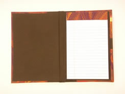 Handmade, hard cover, note pad holder that holds a junior legal size note pad and also a pencil.